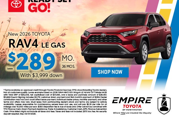 * Terms available on approved credit through Toyota Financial Services (TFS) at participating Toyota dealers. Not all customers qualify. Lease example based on 2026 RAV4 4WD 5Dr. Wagon LE Hybrid CVT Model 4435 with Total SRP of $35,338, net capitalized cost of $31,485, and a lease end purchase amount of $26,150. $3,999 Due At Signing includes $3,710 customer down payment and first month's payment of $289. Dealer contribution may vary and could affect lease payment. Individual dealer prices, monthly payment, and other terms and offers may vary. Must lease from participating dealer's stock and terms are subject to vehicle availability. Lessee responsible for maintenance, excess wear and use, and will pay $0.15 per mile for all mileage over 10,000 miles per year. $350 disposition fee is due at lease end. Offer cannot be combined with TFS Finance Cash, Down Payment Assistance, Trade-in Assistance, Customer Cash, APR, Finance Subvention Cash. Price listed might not include all taxes and fees. Taxes and fees not included. $175 doc fee. No security deposit required. Exp. 03/31/2026.