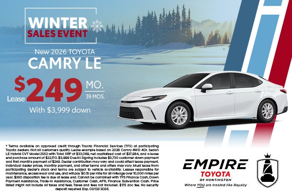 * Terms available on approved credit through Toyota Financial Services (TFS) at participating Toyota dealers. Not all customers qualify. Lease example based on 2026 Camry 4WD 4Dr. Sedan LE Hybrid CVT Model 2552 with Total SRP of $33,089, net capitalized cost of $27,984, and a lease end purchase amount of $22,170. $3,999 Due At Signing includes $3,730 customer down payment and first month's payment of $249. Dealer contribution may vary and could affect lease payment. Individual dealer prices, monthly payment, and other terms and offers may vary. Must lease from participating dealer's stock and terms are subject to vehicle availability. Lessee responsible for maintenance, excess wear and use, and will pay $0.15 per mile for all mileage over 10,000 miles per year. $350 disposition fee is due at lease end. Cannot be combined with TFS Finance Cash, Down Payment Assistance, Trade-in Assistance, Customer Cash, APR, Finance Subvention Cash. Price listed might not include all taxes and fees. Taxes and fees not included. $175 doc fee. No security deposit required. Exp. 02/02/2026.