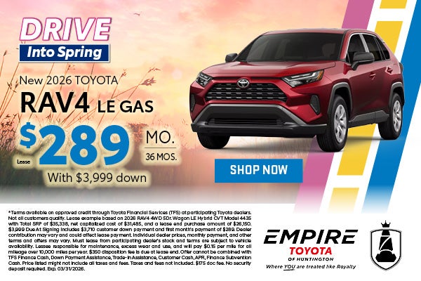 * Terms available on approved credit through Toyota Financial Services (TFS) at participating Toyota dealers. Not all customers qualify. Lease example based on 2026 RAV4 4WD 5Dr. Wagon LE Hybrid CVT Model 4435 with Total SRP of $35,338, net capitalized cost of $31,485, and a lease end purchase amount of $26,150. $3,999 Due At Signing includes $3,710 customer down payment and first month's payment of $289. Dealer contribution may vary and could affect lease payment. Individual dealer prices, monthly payment, and other terms and offers may vary. Must lease from participating dealer's stock and terms are subject to vehicle availability. Lessee responsible for maintenance, excess wear and use, and will pay $0.15 per mile for all mileage over 10,000 miles per year. $350 disposition fee is due at lease end. Offer cannot be combined with TFS Finance Cash, Down Payment Assistance, Trade-in Assistance, Customer Cash, APR, Finance Subvention Cash. Price listed might not include all taxes and fees. Taxes and fees not included. $175 doc fee. No security deposit required. Exp. 03/31/2026.